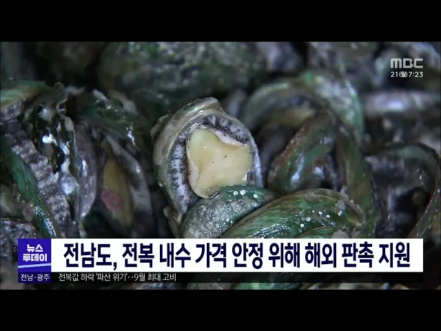 전라남도가 최근 전복가격 하락으로 어려움을 겪고 있는 양식어가를 위해 '전복 수출확대 해외 판촉 지원 사업'에 나섭니다. 지원대상은 전복과 전복 가공 식품을 수출하는 해외 상설 판매장 운영사나 도내 전복 수출입 기업으로 기업당 최대 3천만 원의 판촉행사 비용을 지원할 예정입니다. 지난해 전남에서는 전체 생산량...