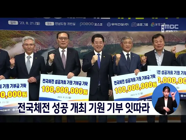 전국체전과 전국장애인체전 성공 개최를 기원하는 기관과 기업 기부가 잇따르고 있습니다. 포스코와 중흥그룹, 우미건설, 보성그룹 등 4개 기업은 전국체전과 전국장애인체전 성공개최를 기원하며 기부금 4억원을 오늘 전남체육회에 기탁했습니다. 현재까지 전국체전 성공개최 기원 기부금 7억 4천만 원과 1억 3천만 원 상...