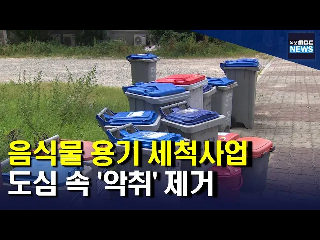 ◀ANC▶ 여름철이면 거리에 있는 음식물 수거용기 등에서 발생하는 악취가 눈살을 찌푸리게 하는데요, 한 지자체가 음식물 수거용기 세척 사업을 추진해 호응을 얻고 있습니다. 박종호 기자가 취재했습니다. ◀END▶ ◀VCR▶ 거리마다 놓여있는 음식물 수거용기. 음식점 등에서 음식물 쓰레기를 이곳에 버리면 환경미화...