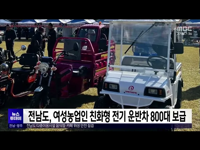 전남도는 여성 친화형 소형 전기 운반차 보급을 확대하기 위해 추경예산으로 800대를 보급한다고 밝혔습니다. 여성 친화형 소형 전기 운반차는 농작물과 농자재 등 운반과 작물 재배관리를 위한 이동수단 등으로 폭넓게 활용할 수 것으로 공급가격550만원가운데 자부담은 30% 입니다. 전남도는 도내 생산제품 위주로 보...