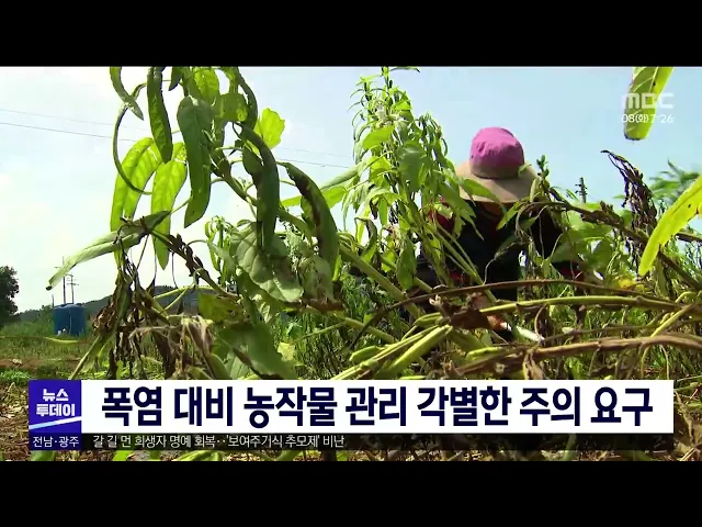 기록적인 폭염이 지속되면서 농작물 관리에 각별한 주의가 요구되고 있습니다. 시군 농사당국은 과수의 경우 특히 햇볕데임 피해를 예방하기 위해 살수 장치와 차광망 등을 덮어 물을 충분히 고급하고, 가장 더운시간대인 낮 12시 부터 오후 5시 사이에는 작업을 자제해야 한다고 강조했습니다. 또 벼논은 물을 깊게 대고, ...