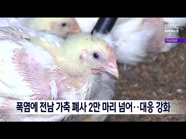 연일 지속되는 폭염 속에 올해 전남지역의 닭과 오리 농가 등 41개 농가에서 2만 167마리가 폐사한 것으로 집계됐습니다. 피해액은 현재까지 1억 3천만 원으로 추산되는 가운데 김영록 전남지사는 "폭염 피해 최소화를 위해 환풍기와 안개분무, 스프링클러 등 시설 장비를 총동원하고, 스트레스 완화제를 적기에 공급하는 ...