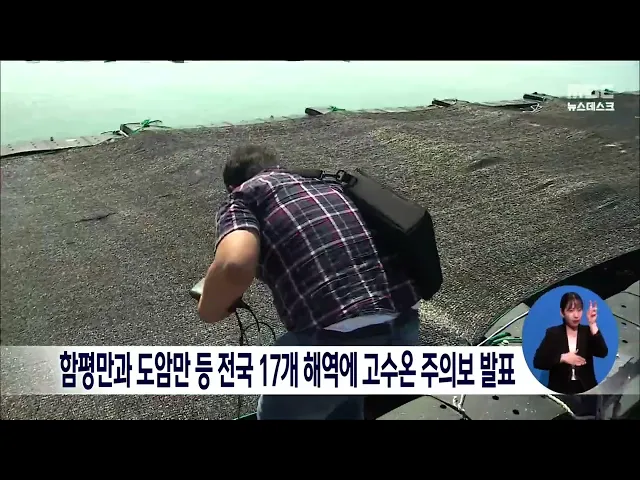 국립수산과학원은 오늘 오전 11시를 기해 고수온 위기경보를 '주의'에서 '심각' 단계로 상향 조정했습니다. 국립수산과학원은 일부 해역의 수온이 28도에 도달할 것으로 예측하고, 함평만과 도암만, 득량만 등 전국 17개 해역에 고수온 주의보를 발표했습니다. 국립수산과학원은 고수온 특보 발표해역을 비롯한 전국 연안 ...