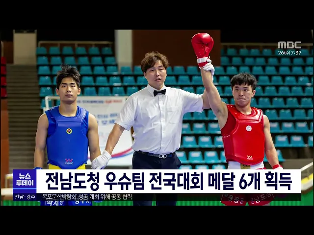 전남도청 우슈선수단이 제16회 대한체육회장배 전국우슈 대회에서 금메달 2개와 은메달 3개 등 총 6개의 메달을 획득했습니다. 우슈 산타 종목에서는 윤웅진 선수가 전승으로 금메달을 따며 최우수선수상을 수상했고, 조의민 선수는 동메달을 획득했습니다.