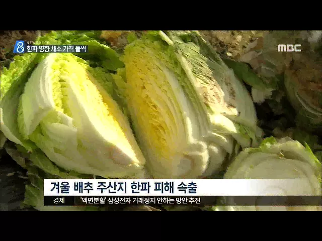 ◀ANC▶ 계속되는 폭설과 한파로 겨울 배추와 무 주산지에서 피해가 속출하고 있습니다. 작업도 어렵고 상품성이 떨어져 장기 저장마저 쉽지 않은데, 나머지 채소 가격도 함께 들썩이고 있습니다. 박영훈 기자가 현장 취재 ◀END▶ 겨울배추의 70%를 생산하는 해남군에 있는한 영농법인 냉동 창고입니다. 수확한 겨울배추...