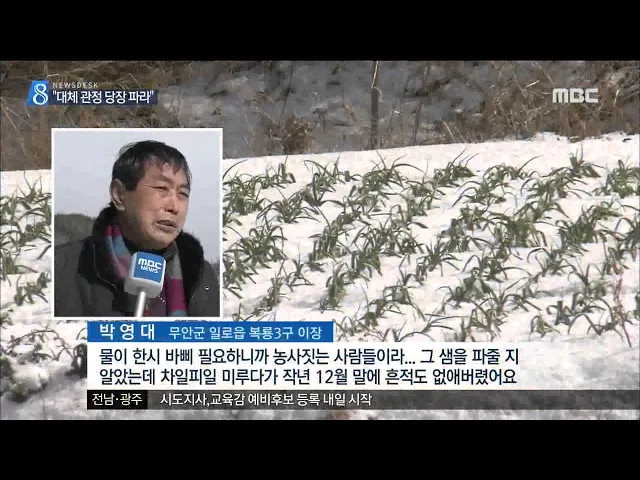 ◀ANC▶ 도로를 만드는 공사때문에 농업용 관정이 매립된 농촌마을이 있습니다. 봄 영농철을 앞두고 대체 관정 개발이 되지 않는다며 주민들이 반발하고 있습니다. 양현승 기자입니다. ◀END▶ ◀VCR▶ 국가지원지방도 49호선 공사가 진행 중인 농촌마을. 1999년부터 써왔던 농업용 관정이 도로에 편입되면서 지난해 말 ...
