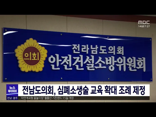 전남도의회 안전건설소방위원회는 심폐소생술 교육 활성화에 관한 일부 개정조례안을 의결했습니다. 개정된 조례안은 고위험 만성질환자 가족과 소속 공무원으로 심폐소생술 교육 범위 확대하고 , 도민의 인식을 높이기 위한 홍보활동 지원 등의 내용이 담겨 있습니다.