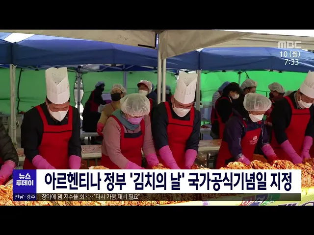 한국농수산식품유통공사(aT)에 따르면 아르헨티나 정부가 한국이 김치 종주국임을 명시한 '김치의 날' 제정 결의안이 최근 연방 상하원을 통과했습니다. 결의안은 매년 11월22일을 아르헨티나 '김치의 날'로 제정하고, 김치의 역사와 우수성과 함께 한국이 김치의 종주국이며 2013년 유네스코가 김치 준비·보존과정인 김장...