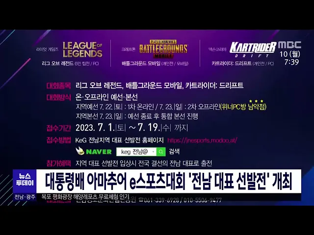 대통령배 아마추어 e스포츠대회에 출전할 전남 대표 선발전이 오는 22일부터 이틀동안 온*오프라인으로 열립니다. 대회 종목은 5인 팀전의 리그오브레전드와 개인전으로 치러지는 배틀그라운드, 카트라이더 등 3개 종목으로 참가를 희망하는 도민은 오는 19일까지 지역 대표 선발전 누리집으로 신청할 수 있습니다.