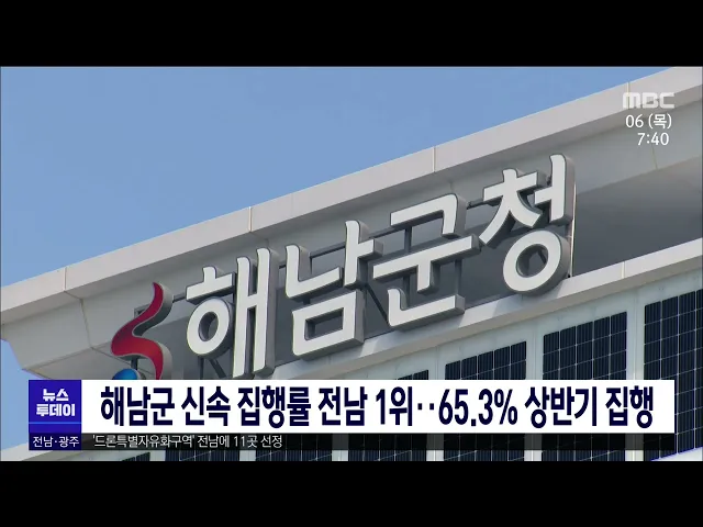 해남군이 2023년 상반기 지방자치단체 신속집행에서 대상액 4,935억원 가운데 65.3%의 집행률로 전남 1위를 차지했습니다. 해남군은 특히 소비·투자분야에서 상반기 목표액 1,923억원 대비 2,486억원을 초과 집행해 129.3%의 집행률을 달성한 것으로 평가됐습니다. 해남군은 지난해 1조 3,217억원을 운용해 전국 군단위 가...