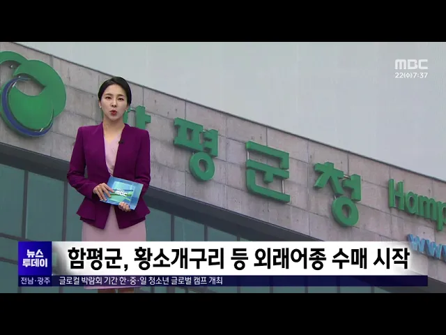 ◀ 앵 커 ▶오늘의 간추린 뉴스입니다. 함평군이 토산어종 보호와 지역 생태계 복원을 위해황소개구리 등 외래어종 수매사업에 나섰습니다. 이번 사업은 영산강에서 어업허가를 가진단체의 신청을 받아 배스와 블루길, 황소개구리 등 총 10톤을 수매하며kg당 4천 원의 보상금을 지급할 예정입니다. -------------- 신안군이 ...