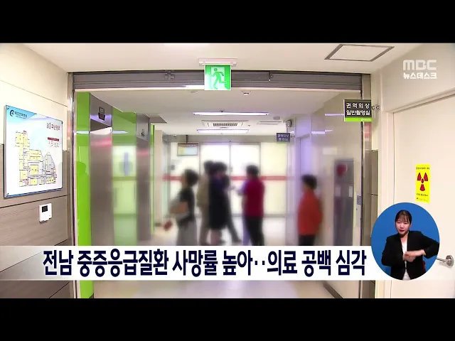 뇌졸증과 심근경색 등 중증응급질환과 관련해 전남지역 의료 공백이 심각한 것으로 조사됐습니다. 경실련이 2021년 전국 권역응급의료센터를 대상으로 병원 내 사망률을 분석한 인구 10만 명 당 뇌졸중 사망자가 전남은 2.1명으로 전국평균 1.76명보다 높았고, 심근경색증 사망자도 8.01명으로 전국 평균 6.75명보다 높았습...