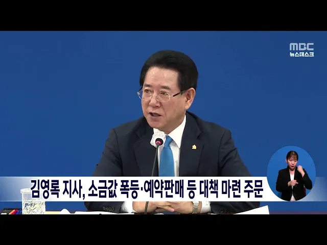 김영록 지사가 전남도 실국장 정책회의에서 최근 폭등한 소금값과 관련해 "본격 생산시기인 7월까지 예약판매 시스템 마련 등 체계적인 대책을 마련하라"고 지시했습니다. 김 지사는 "소금값 폭등은 전국적 현상이지만 전남이 전국 생산량의 90%를 차지하는 주산지로서 책임감을 갖고 대책을 마련해야 한다"며 "예약 판매...