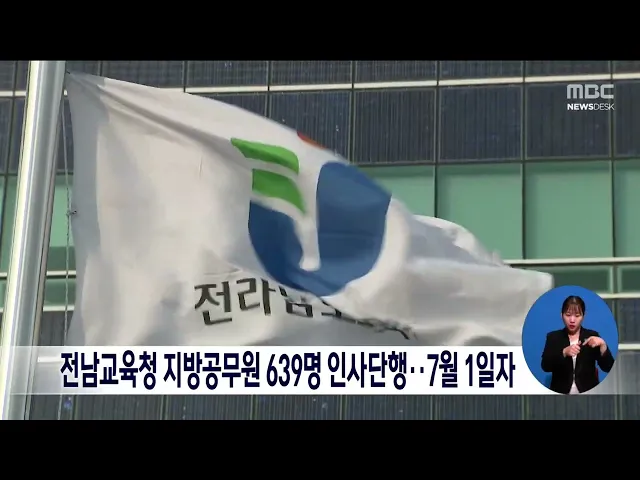 전라남도교육청은 오늘(20) 지방공무원에 대한 7월 1일자 정기인사를 단행했습니다. 이번 인사에서 전남교육청 미래교육과 김옥란 기후환경교육팀장 등 7명이 교육지원청 신임 과장으로 보직되는 등 전보 333명, 신규 임용 8명 등 639명의 인사가 이뤄졌습니다.