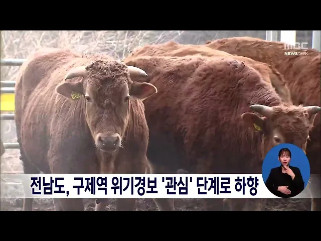 전라남도가 구제역 위기경보 단계를 심각에서 관심 단계로 하향 조정했습니다. 전라남도는 지난달 18일 이후 정밀검사에서 구제역이 검출되거나 구제역 증상을 보이는 농장이 없어 구제역 추가 발생과 확산 위험이 낮다고 보고 위기경보 단계를 낮췄습니다. 전라남도는 구제역 위기 경보는 하향됐지만 아직 안심 단계는 아...