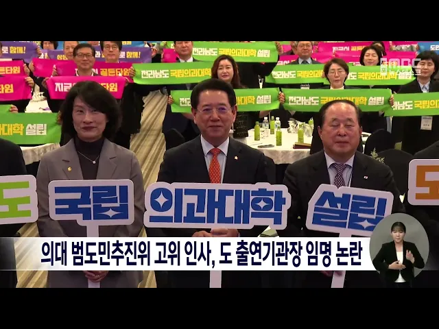 전라남도가 의대 유치 범도민추진위원회 고위 인사를 도 출연기관장에 임명해 논란이 일고 있습니다.김영록 전남지사는제2대 전남인재평생교육진흥원장에화순전남대학교병원장 등을 역임한범희승 원장을 임명했는데 신임 범희승 원장은불과 며칠 전까지 전남 의대 범도민추진위집행위원장을 맡아왔습니다.전라남도가의대 유...