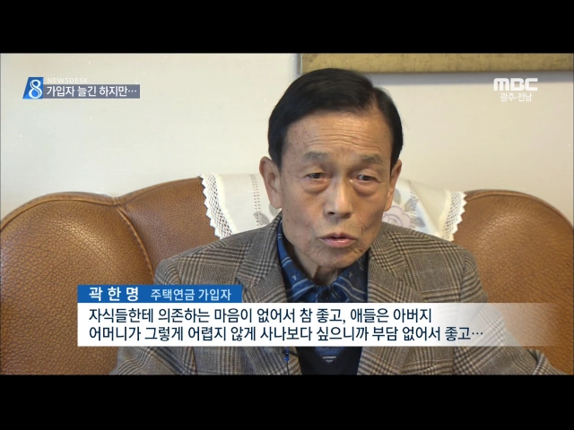 (앵커) 살고 있는 집을 담보로 맡기고 연금을 받는 주택연금 가입자가 광주·전남에서 늘고 있습니다. 하지만 아직도 전국 점유율 면에선 매우 저조하기만 합니다. 왜 그런지 /// 기자가 보도합니다. (기자) 6년 전에 주택연금에 가입한 83살의 곽한명 할아버지.. 살고 있는 아파트를 담보로 매달 52만원 가량의 연금을 받고...