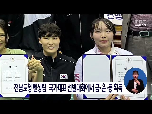 전남도청 펜싱팀이 지난달 27일부터 충남에서 열린 국가대표 선발대회 개인전에서 금*은*동 각각 한 개씩을 획득하며 선전했습니다. 여자에페 개인전에서는 김향은 선수가 결승에서 강원도청 이신희 선수를 15대 7로 꺾고 금메달을 따냈고, 박소형 선수는 동메달을, 여자사브르 개인전에서는 최세빈 선수가 은메달을 획득...