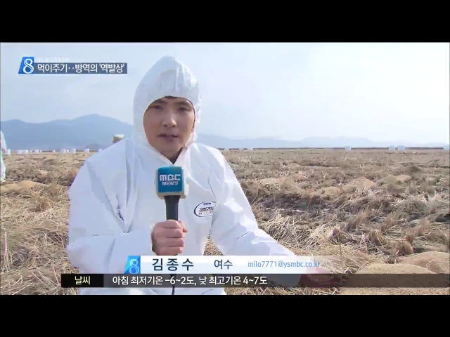◀ANC▶ AI 확산여파가 이어지고 있는 가운데 지자체 별로 방역작업에 힘을 쏟고 있습니다. 이런 가운데 철새도래지인 고흥만 일대에서는 먹이주기 사업을 통해 철새 이동 확산을 막는 이색 방법을 동원해 눈길을 끌었습니다. 김종수 기자입니다. ◀VCR▶ 지난해부터 시작된 전국적인 AI확산 여파가 칼바람만큼 매섭습니...