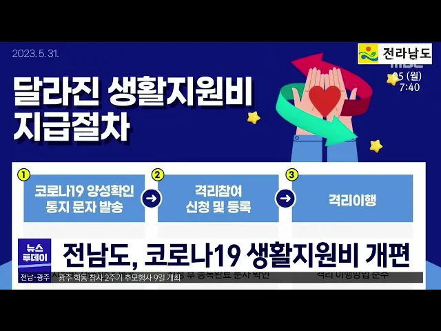 전라남도가 코로나19 방역조치가 완화됨에 따라 입원˙격리자 생활지원비 지원절차를 변경합니다. 코로나19 확진자는 보건소에 격리참여자로 등록 신청을 해야 생활비 지원이 가능하며, 병원에 입원했다면 입퇴원 확인서로 격리를 확인합니다. 적용 대상자는 6월 1일부터 양성 확인 통지 문자를 받은 사람부터 적용되며 지원...