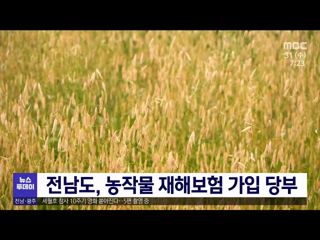 전라남도가 자연재해에 따른 농가 피해 최소화를 위해 농작물 재해보험 가입을 당부했습니다. 대상 품목은 귀리와 옥수수 등 70개 품목으로 지난해부터 지원 비율이 90%로 상향돼 농가는 보험료의 10%만 부담하면 됩니다. 전라남도는 가입 면적 15만 8천 ha, 가입률 70%를 목표로 다양한 홍보를 이어갈 예정입니다.