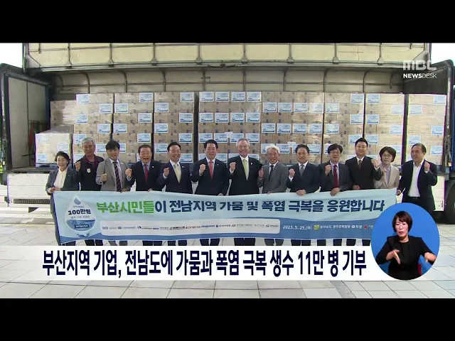 부산지역 11개 기업들이 전남지역 가뭄과 폭염 극복을 위해 생수 11만병을 전라남도에 기부했습니다. 이번에 기부된 생수 11만병은 가뭄으로 어려움을 겪은 전남 도서지역에 전달될 예정이며 또, 여름철 폭염에 대비하기 위해 홀로사는 어르신 등 노약자들에게도 전달될 예정입니다.