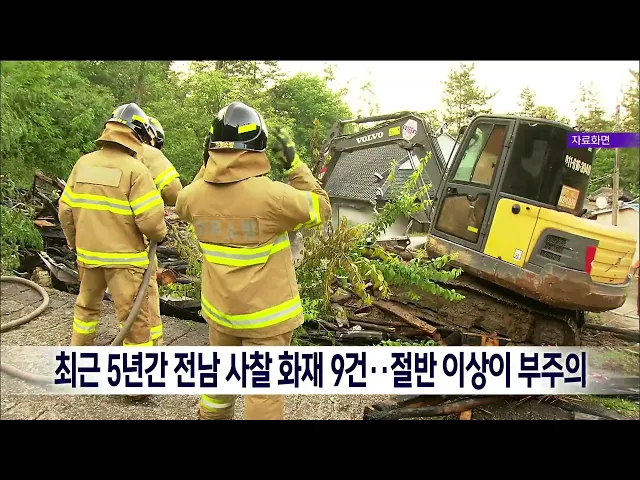 최근 5년 동안 전남 도내 사찰에서 발생한 화재 9건 가운데 부주의로 인한 화재가 5건으로 절반이 넘는 것으로 나타났습니다. 다음으로는 전기적 요인, 자연적 요인이 뒤를 이었으며 이들 화재로 인해 1억 1천 8백여만 원의 재산피해가 집계됐습니다. 전남소방본부는 오는 27일 부처님 오신 날을 앞두고 도내 사찰 496곳에...