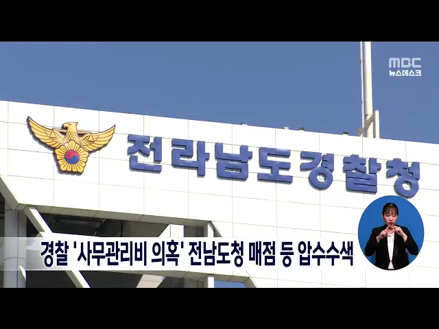 전남도청 사무관리비 부당집행 의혹을 수사하고 있는 경찰이 오늘(15), 전남도청 매점과 공무원 노조 사무실 등을 압수수색했습니다. 전남경찰청은 도청 일부 공무원들이 도청 1층 매점을 이용해 사무관리비로 유명 인터넷사이트에서 사적 물품을 구매한 정황 등을 확인하기 위해 컴퓨터 등 관련 자료 확보에 나선 것으로 ...