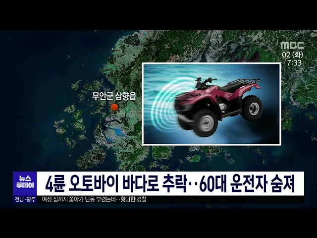 어제(1) 저녁 7시 40분쯤 무안군 삼향읍의 한 뚝방에서 68살 정 모씨가 타고가던 4륜 오토바이가 3미터 아래 바다로 추락해 정 씨가 숨졌습니다. 경찰은 목격자 등을 상대로 정확한 사고 경위를 조사하고 있습니다.