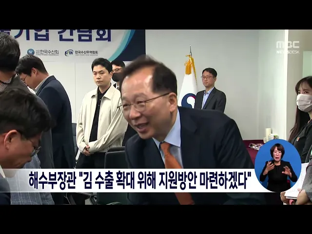 조승환 해양수산부 장관이 서해어업관리단에서 전남지역 김 수출기업들과 간담회를 열고 수산식품 수출 확대방안을 논의했습니다. 이번 수출기업 간담회에서 조승환 해양수산부장관은 올해 변화된 수출 여건에 대한 건의사항을 듣고 해외 판로 확보 등을 위한 다각적인 지원방안을 마련해 김 수출 확대에 적극 노력하겠다고...