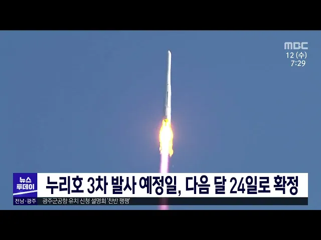 실제 위성을 탑재한 누리호 3차 발사 예정일이 다음 달 24일로 확정됐습니다. 과학기술정보통신부는 누리호 발사관리위원회를 열고 누리호 3차 발사 예정일을 다음 달 24일, 발사 예정시각은 오후 6시 24분으로 결정했으며, 기상 등에 의한 일정 변경 가능성을 고려해 발사 예비일은 다음 달 25일부터 31일까지로 설정했습...