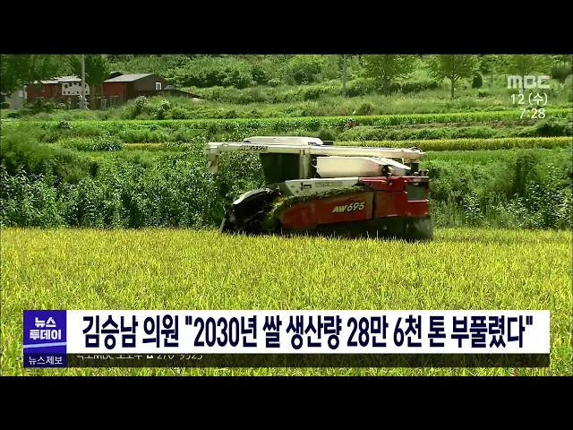 김승남 국회의원은 농촌경제연구원이 2030년 쌀 생산량 예측치를 부풀렸다고 주장했습니다. 김 의원은 농촌경제연구원이 쌀 생산량을 예측할 때 단위면적당 쌀 생산량을 부풀려 2030년 쌀 생산량 예측치를 28만 6천 톤이나 부풀렸다며 쌀값 정상화법이 시행되면, 2030년 쌀 초과 공급량이 63만 톤을 넘어설 것이라는 정부 ...