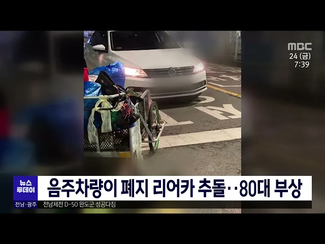 어제(23) 저녁 8시쯤 목포시 원산동에서 50대 김 모 씨가 몰던 승용차가 폐지를 줍던 80대 임 모 씨의 리어카를 추돌해 임 씨가 부상을 입고 병원으로 이송됐습니다. 경찰 조사 결과 운전자 김 씨는 면허취소수치인 혈중알코올농도 0.107%로 운전을 한 것으로 확인됐습니다. 경찰은 운전자를 입건해 정확한 사고 경위를 조...