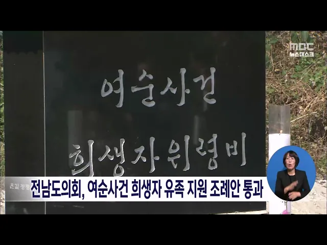 여순사건 희생자 유족에 전라남도가 생활비를 지원할 수 있게 됩니다. 전남도의회는 임시회 본회의에서 신민호 의원이 대표 발의한 여순사건 희생자 유족 생활보조비 지원 조례안을 가결했습니다. 지원 조례는 전남에 주민등록을 두고 거주하는 희생자의 배우자와 형제·자매, 자녀 등을 대상으로, 매달 생활보조비를 지급하...