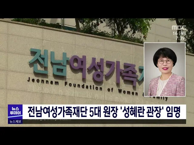 전남여성가족재단 5대 원장에 성혜란 전 여수여성인력개발센터 관장이 임명됐습니다. 성헤란 원장은 재단의 경영 효율화로 체계적이고 안정적인 혁신을 도모하고 전남 도민의 일상적 성평등 실현을 위해 노력하겠다고 취임 소감을 밝혔습니다.