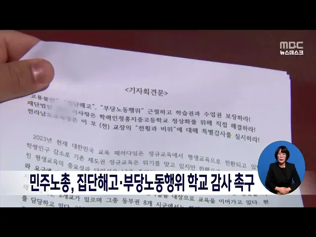 민주노총 전남중소사업장연대노조가 집단해고와 부당노동행위를 한 전남의 한 학교에 대해 전남교육청의 특별 감사를 촉구했습니다. 노조는 지역의 한 재단법인이 학교에 대한 관리와 감독을 소홀히 해 임금 일부를 미지급하고 퇴직정산금도 체불하고 있으며, 노조에 가입했다는 이유로 7명의 정교사를 권고사직 통보했다고...