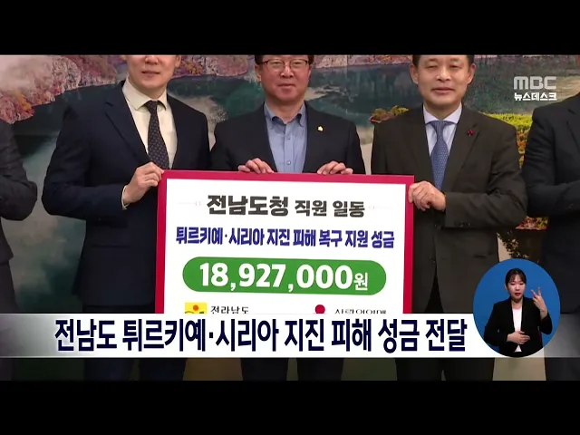 전라남도가 튀르키예와 시리아 지진 피해 복구와 이재민 구호에 써달라며 직원들이 모은 천982만 원을 전남사회복지공동모금회에 전달했습니다. 이에 앞서 지난 달 예비비 10만 달러를 대한적십자사에 기탁한 전라남도는 이달말까지 지진 피해 특별 성금 모금 운동을 이어갈 계획입니다.