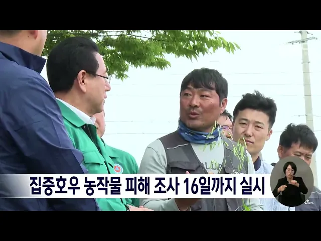 전라남도는최근 내린 집중호우에 따른 농작물 피해조사를오는 16일까지 실시합니다.지난 5일과 6일 전남에는 평균 100mm의 비가내려 벼 등 침수 350ha, 귀리 등 쓰러짐 1627ha 등의 피해가 발생했습니다.전라남도는피해 농업인에게 작물에 따라 농약대는 ha당 100만원에서 250만원,대파대는 400-500만원 등을 지원할 예정입...
