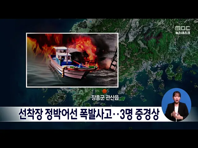 오늘(9) 오후 6시 55분쯤 전남) 장흥군 관산읍 우산선착장에 정박 중이던 3톤급 어선이 폭발했습니다. 이 사고로 선원 3명이 중경상을 입고 병원으로 옮겨졌습니다. 해경은 선박 선실에서 시동 점검을 하던 중 폭발이 난 것으로 보고 정확한 사고 경위를 조사하고 있습니다.