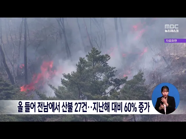 올들어 전남에서 발생한 산불이 27건으로 지난해 같은 기간 대비 60% 증가한 것으로 나타났습니다. 전라남도는 특히 봄철인 3,4월에 산불 위험이 더 높아질 것으로 보고 논밭두렁이나 쓰레기 소각 행위, 산림 근처에서 흡연이나 불씨를 다루는 행위 등을 하지 말아줄 것을 당부했습니다.