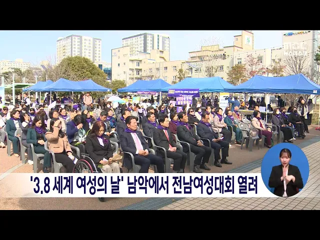 3.8 세계 여성의 날을 맞아 전남여성인권단체들이 함께 남악중앙공원에서 제14회 전남여성대회를 열었습니다. '성평등을 향해 전진하라'는 주제로 열린 오늘 행사에서는 여성 정치인과 농업인 등 150여 명이 참석한 가운데 전남여성선언문 낭독에 이어 폭력에 저항하고 연대하자는 의미를 담은 플래시몹 등이 펼쳐졌습니다....