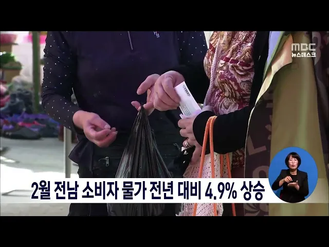 전남의 소비자물가가 여전히 고물가를 유지하고 있습니다. 통계청이 발표한 2월 소비자물가동향에 따르면 전남의 소비자물가지수는 110.70으로 전달보다 0.1%, 지난해 같은 달보다 4.9% 올랐습니다. 품목별로는 전기와 가스, 수도 등이 지난해 같은 달 대비 27.3%로 가장 많이 올랐고 농축수산물은 2.1% 상승한 것으로 나타...