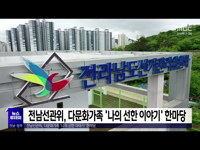 전라남도선거관리위원회는제13회 유권자의 날을 맞아다문화 가족이 우리나라와 모국에서의 선거 경험을 소개하는 '나의 선한 이야기' 한마당을 개최했습니다. 이 자리에서는 본선에 오른일본과 베트남, 필리핀 등 각국 6명의참가자가 유창한 우리말로 자신들의 선거 경험을 발표했으며 이란의 선거 제도를 쉽게 설명한이...