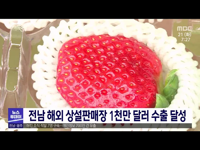 전라남도 해외 농수산식품 상설 판매장이 지난해 천만 달러 수출 실적을 달성했습니다. 전남 해외 상설 판매장은 9개 나라, 20곳으로 쌀과 딸기, 배, 김 등 신설 농수산물과 가공식품까지 전남산 5백여개 제품이 판매돼 안정적인 수출 판로 확보와 전진기지로서의 역할을 톡톡히 하고 있습니다. 전라남도는 올해 신규 해외...