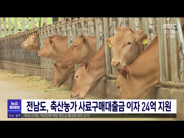 전라남도가 축산농가 경영안정을 위해 작년 발생한 사료구매대출금 2446억 원의 이자 24억 원을 지원합니다. 작년 사료구매자금 대출을 받은 축산농가는 2786곳으로 융자금액에 대한 대출이자 1%가 지원돼 축산농가는 이자 부담이 사라지는 효과가 기대됩니다.