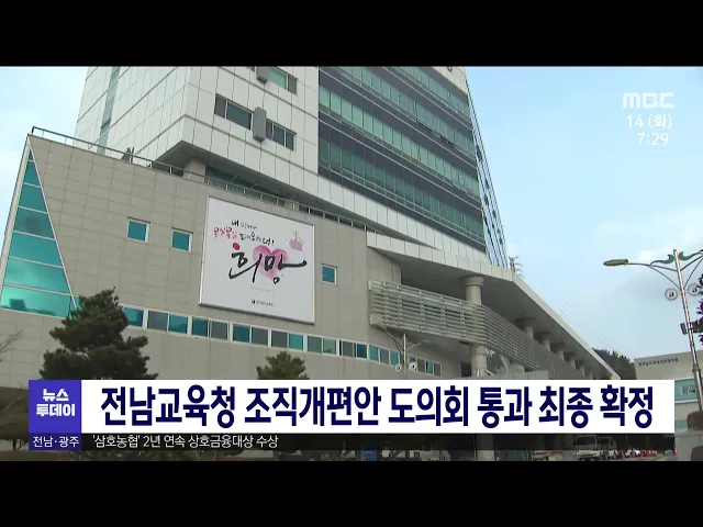 전남교육청 조직개편안이 전남도의회를 통과해 최종 확정됐습니다. 전남교육청은 이번 조직개편에 따라 본청 조직은 기존 ‘3국 2관 1단 14과 61팀’에서 ‘3국 2관 1단 15과 64팀’으로 바꾸고 미래교육과 개편과 독서인문교육팀 신설 등을 통해 전남 미래교육 기반을 마련해 나가기로 했습니다. 또 교육지원청은 보건급식팀과...
