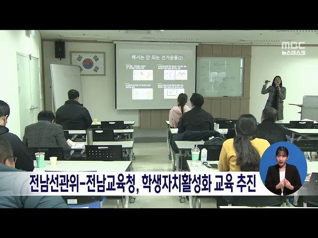 전남선관위와 전남교육청이 학교 선거와 관련된 교사의 역할과 책임 의식을 높이기 위해 '학생자치 활성화 교사역량 강화' 연수를 진행하고 있습니다. 전남선관위는 지역 초·중교사 40명을 대상으로 청소년 선거 교육 경험사례와 교수법을 강의하는 등 민주시민 교육 활성화에 더욱 기여할 방침입니다.