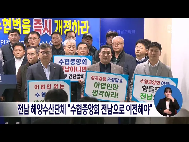 전라남도어촌계협의회 등 전남지역 해양수산단체들이 전남도의회에서 기자회견을 열고 수협중앙회의 전남 이전을 촉구했습니다. 이들은 "수협은 수산인의 이익 증진과 지원을 위해 설립된 기관인 만큼 전국에서 가장 많은 어업인이 활동하고 수산물 생산량이 많은 전남에 본사를 둬 지역 불균형을 완화하고 경쟁력을 강화해...