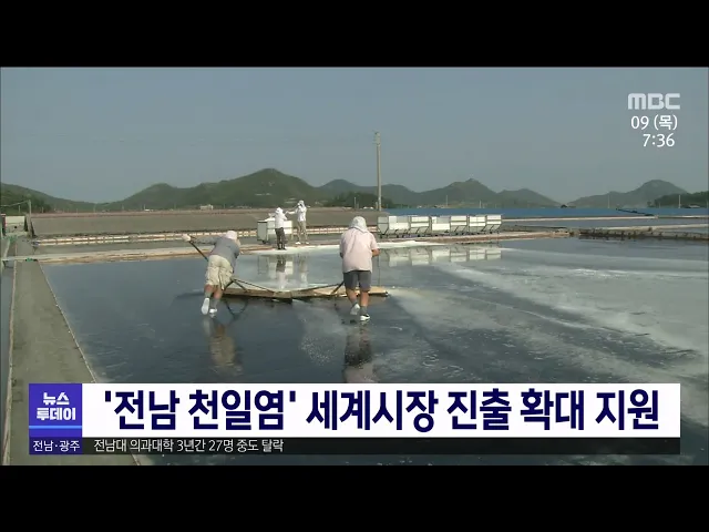 전라남도는 천일염의 경쟁력 강화와 세계시장 진출 확대를 위해 올해 2개 사업에 1억 8천만 원을 투입합니다. 전라남도는 ‘천일염 수출 활성화 지원사업’과 ‘천일염 수출용 제품개발 지원사업’을 추진해 영세한 천일염 수출업체의 상품 개발과 마케팅 분야를 지원하고 적극적인 해외시장 개척, 판로 확대에 나설 계획입니다...