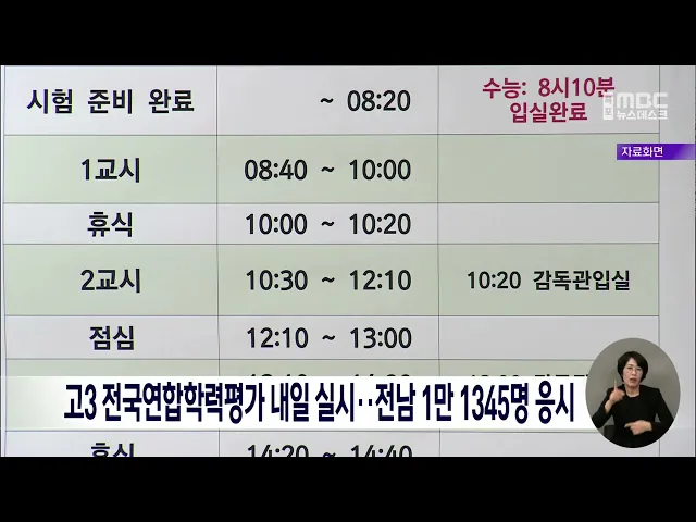 고 3학년생을 대상으로 한 5월 전국연합학력평가에 전남에서는 94개교 만천3백45명이 응시합니다. 내일(8일) 오전 9시부터 일제히 실시되는 연합평가 영역은 국어, 수학, 영어, 한국사, 탐구 등으로, 특히 4교시에는 한국사와 탐구 영역 답안지를 각각 배부하고 회수하는 점에 유의해야 합니다. 전남교육청은 이번 평가...